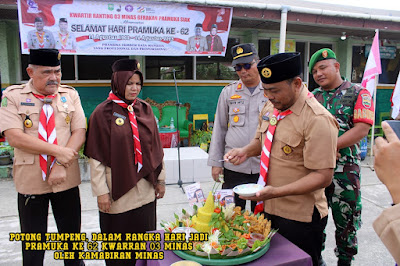 Pemotongan kue dimulai dari sekretaris Camat Minas Muhammad Darwis,S.Sos , potongan tumpeng tersebut diserahkan kepada ketua Kwartir Ranting 03 minas Kasbetri,S.Sos, untuk pemotongan tumpeng yang kedua dilakukan oleh ketua Kwartir Ranting Minas Kasbetri yang kemudian potongan tumpeng tersebut diberikan kepada Kapolsek Minas yaitu bapak AKP Wan Mantazakka, SH, MH.